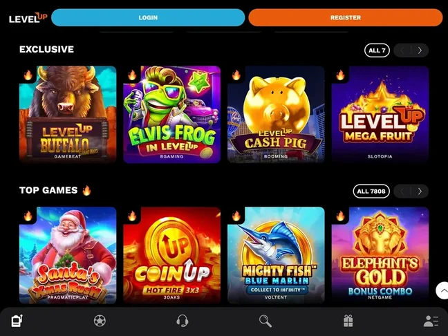 Online casino Level Up gives its users the opportunity to try out almost any of the pokies available in the platform's gaming library for free. To do this, just hover your mouse over the game icon and click "DEMO". This way, you can get to know the gameplay for free and practice some skills or come up with a strategy before making a deposit, placing bets and playing for real money. That is, new casino visitors don't even need to register on the website if they want to play just for fun, without risking their finances.